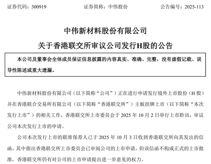 近日,贝多商业&贝多财经注意到,A股上市新能源材料公司中伟新材料股份有限公司(300919.SZ,下称“中伟股份”)于2025年10月23日在港交所更新了上市申请资料,摩根士丹利、华泰国际为其联席保荐人。