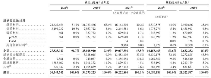 相比之下,中伟股份的新能源金属产品收入由2023年33.88亿元翻倍增至2024年的134.83亿元,收入贡献直接占到三分之一以上;2025年上半年该公司的收入亦实现了44.0%的增长,来到92.73亿元,占比与新能源电池材料旗鼓相当。