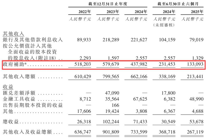 值得注意的是,中伟股份2022年、2023年、2024年度和2025年上半年(即“报告期”)收到并计入损益的政府补助分别为5.18亿元、5.80亿元、4.38亿元和1.33亿元,占各期净利润的比例分别为33.7%、27.6%、24.5%和18.9%。