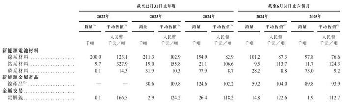 即便是销量呈指数型增长的新能源金属产品,也难逃平均售价走低的浩劫。中伟股份镍产品的平均售价由2023年的10.98万元/吨降至2024年的10.22万元/吨,截至2025年6月末的平均售价仅为9.39万元/吨。