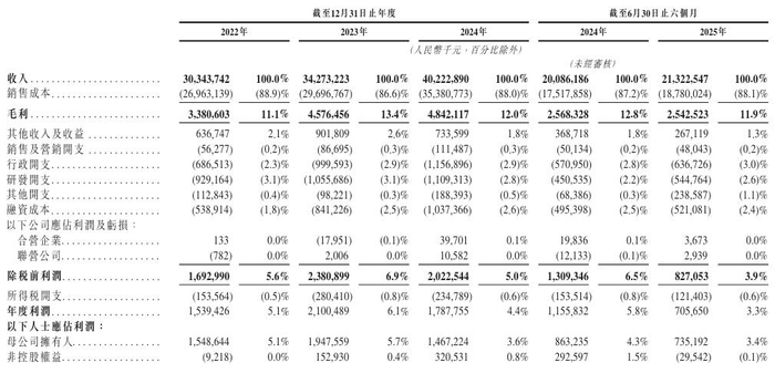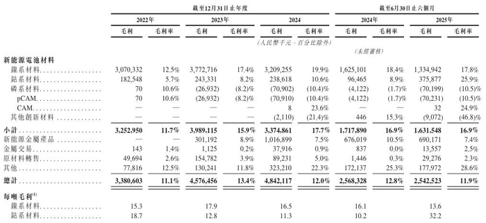 受销售价格降低、产品组合变动和原材料价格波动等因素的共同影响,中伟股份的毛利虽然由2022年的33.81亿元增长至2024年的48.42亿元,但报告期各期的毛利率分别为11.1%、13.4%、12.0%和11.9%,整体呈波动下滑趋势。