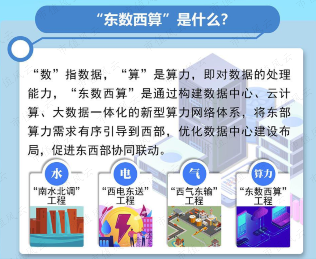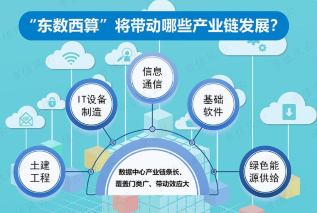 而随着“东数西算”工程的实施,将带动信息通信、IT设备制造、基础软件、土建工程、绿色能源供给等产业链的发展。