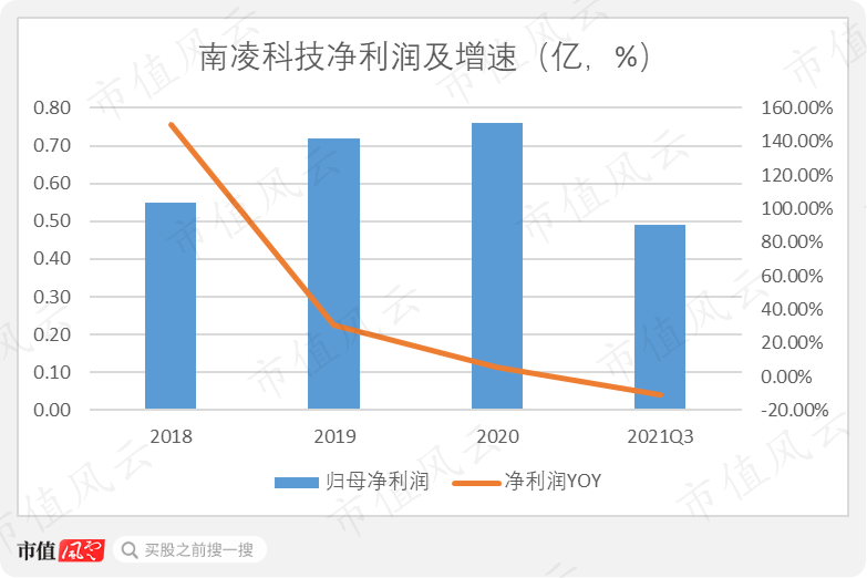 2020年上市当年,南凌科技实现营收4.95亿,同比上年还下降了1.39%。2021年前三季度,南凌科技实现营收4.16亿,同比上升14.86%,实现净利润4892万,同比下滑11%。