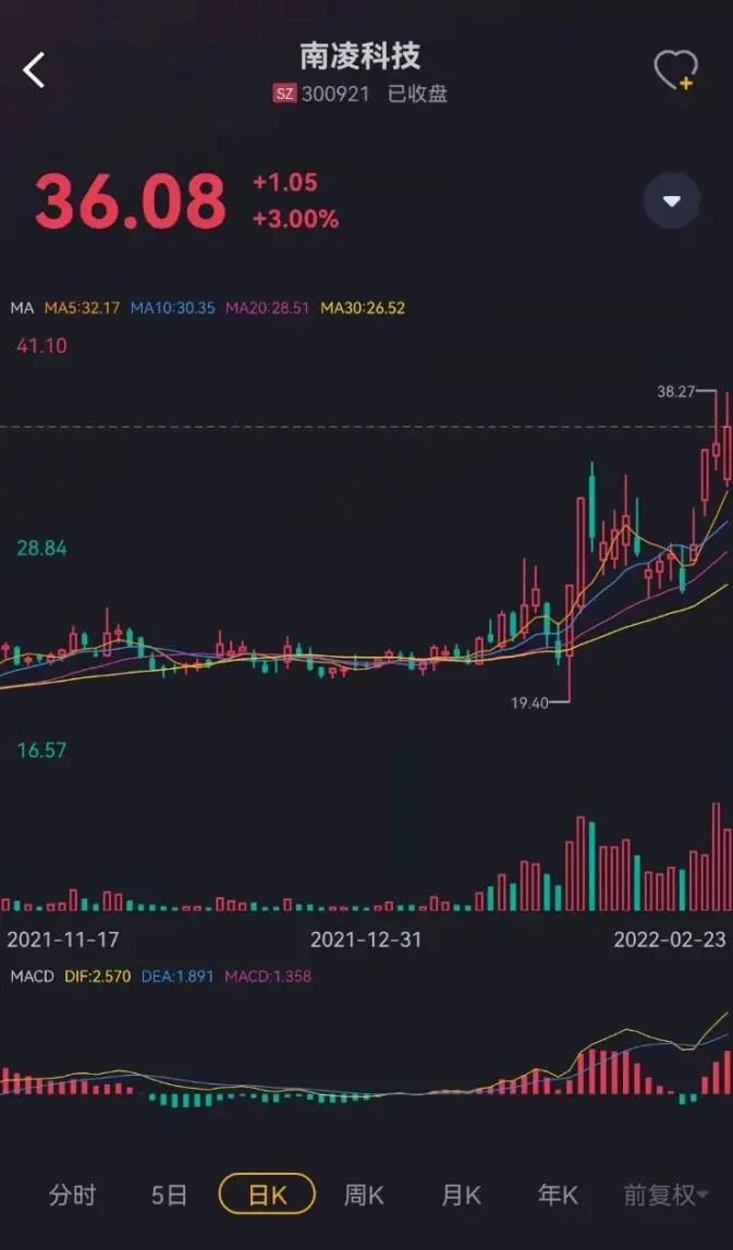 此后,南凌科技的股价便接连攀升,2月18日至2月23日,4个交易日股价累计上涨38%。其中,2月21日,还收获了一条20cm大长腿。
