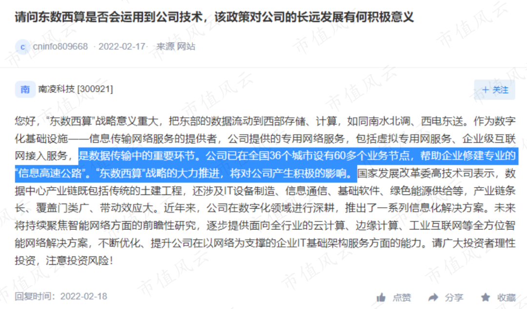 有意思的是,第二天(2月18日),南凌科技(300921.SZ)便按耐不住在互动易平台表示,公司作为信息传输网络服务的提供者,主业是数据传输的重要环节,在全国36个城市设有60多个业务节点,“东数西算”的推进,将对公司产生积极影响。