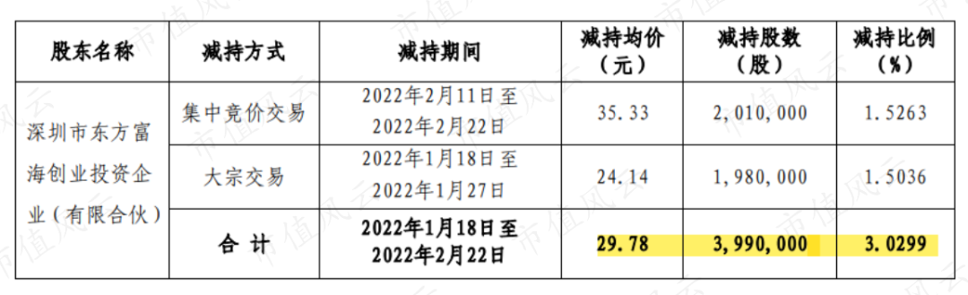 简言之,东方富海在2022年1-2月期间,累计减持399万股,占公司总股本的3.03%,累计套现约1.2亿元。
