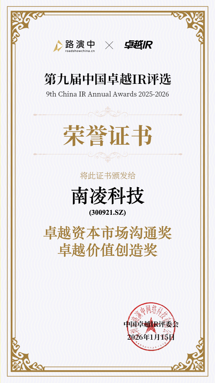 近日,第九届中国卓越IR年度评选结果正式公布。南凌科技成功摘得“卓越资本市场沟通奖”与“卓越价值创造奖”两项殊荣。此次获奖,标志着公司在投资者关系建设、信息披露质量及长期价值传递等方面,获得了资本市场的权威认可。