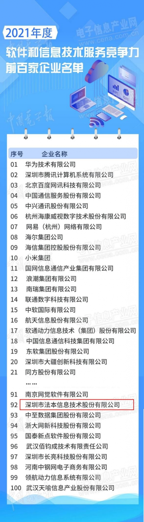 8月27日,中国电子信息行业联合会主办的2021年度软件和信息技术服务企业竞争力报告及前百家企业发布会在北京举办,发布会公布2021年度软件和信息技术服务竞争力百强企业,法本信息榜上有名。