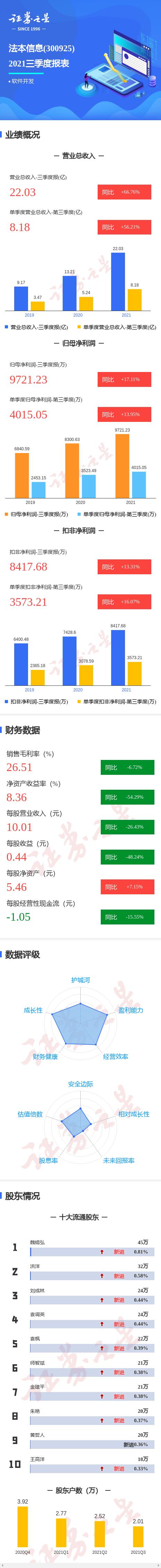 法本信息2021三季报显示,公司主营收入22.03亿元,同比上升66.76%;归母净利润9721.24万元,同比上升17.11%;扣非净利润8417.69万元,同比上升13.31%;其中2021年第三季度,公司单季度主营收入8.19亿元,同比上升56.21%;单季度归母净利润4015.06万元,同比上升13.95%;单季度扣非净利润3573.22万元,同比上升16.07%;负债率28.88%,投资收益549.55万元,财务费用49.86万元,毛利率26.51%。