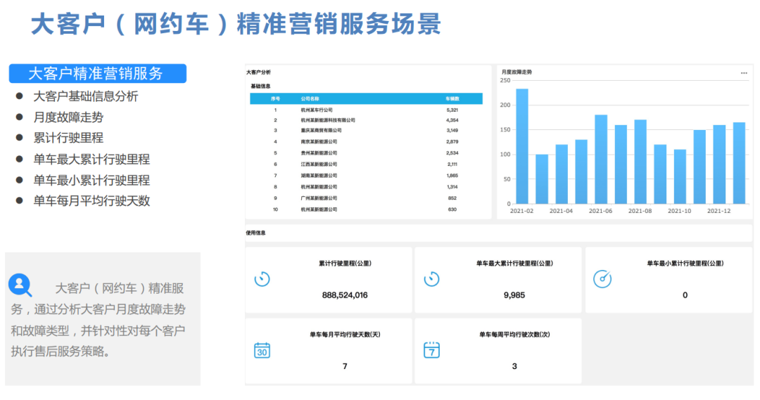 大客户(网约车)精准营销服务场景:通过分析大客户月度故障走势和故障类型,并针对性对每个客户执行售后服务策略