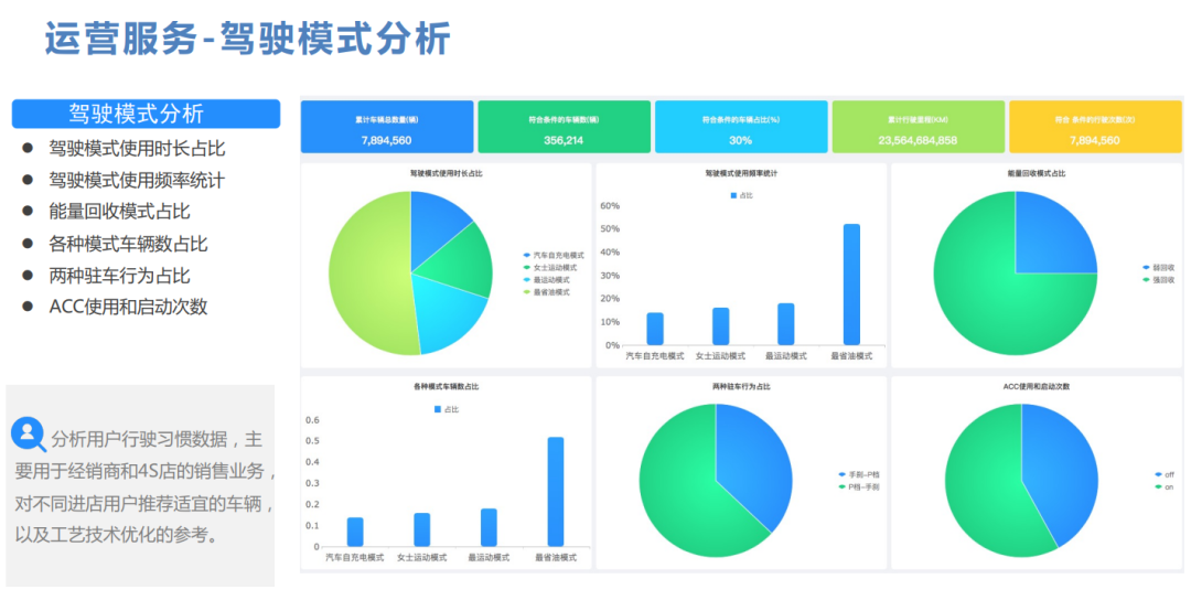 运营服务:通过分析用户驾驶模式、空调使用习惯等数据,用于经销商和4S店的销售业务,对不同进店用户推荐适宜的车辆,以及工艺技术优化的参考