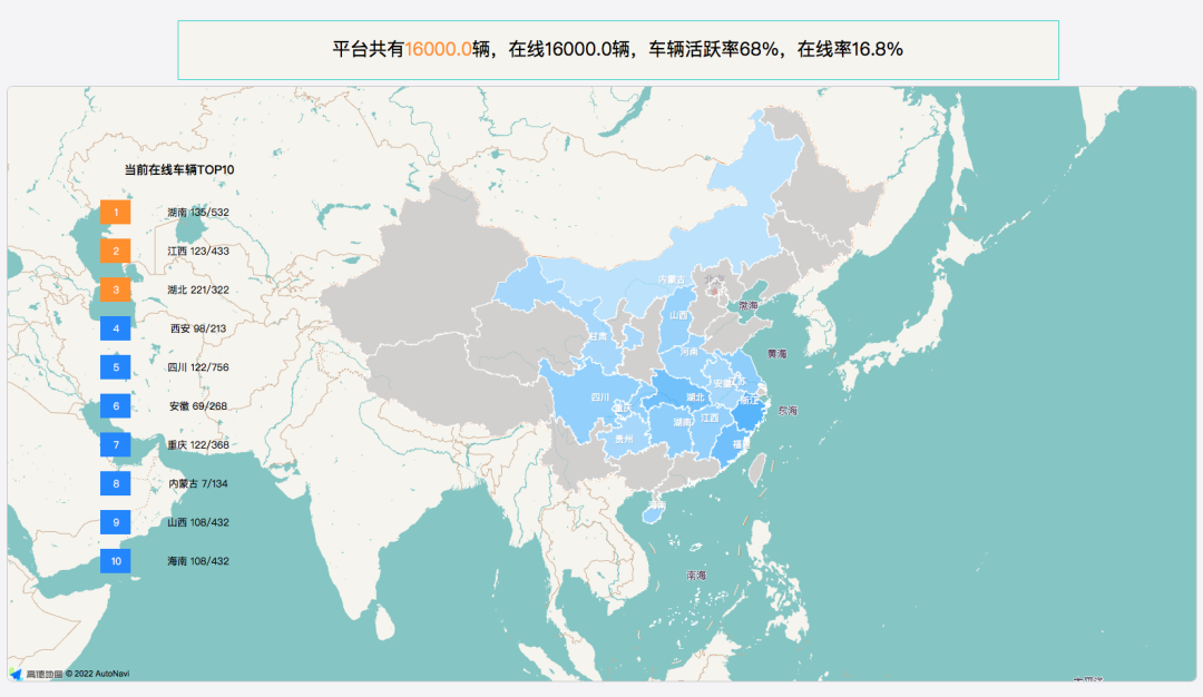 全局运行监控:对所有车辆进行监控,统计总数、在线数、活跃度、在线率、车辆全国分布等,车辆轨迹回放