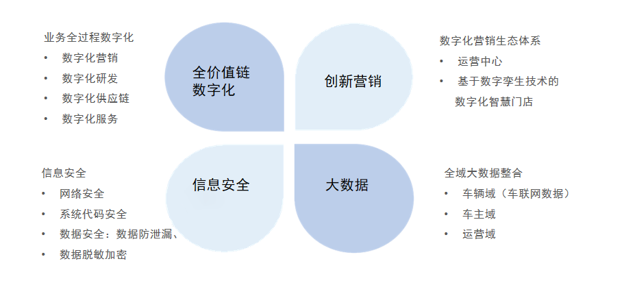 助力客户在新赛道格局咖位升级,破局新能源汽车全价值链数字化、创新营销、信息安全、大数据四大重要课题。