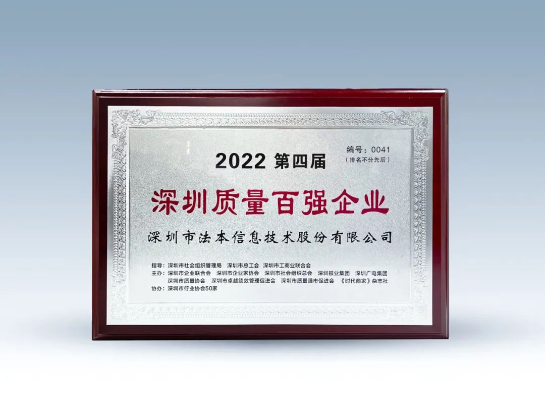 继“广东企业500强”后,法本信息历经企业质量管理体系、创新能力、市场占有率、行业荣誉、专业品质、经营业绩、社会责任等多方面的严格考核,再获“第四届深圳质量百强企业”荣誉称号。