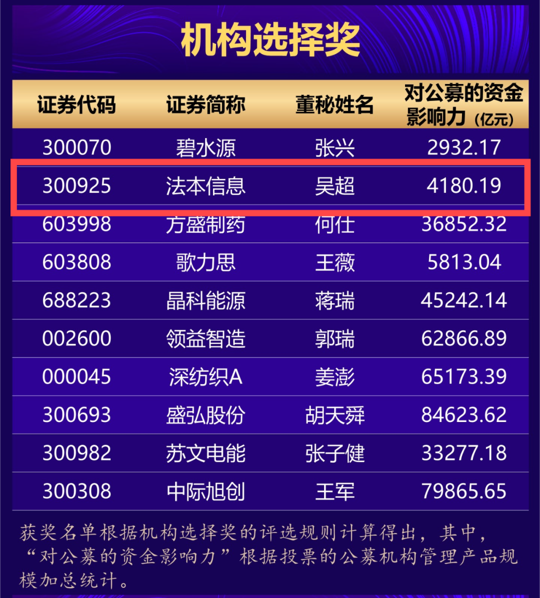 ▲法本信息董事、董事会秘书兼副总经理吴超先生当选“金牌董秘”,在5000余家上市公司董秘激烈评选当中脱颖而出,名列前茅