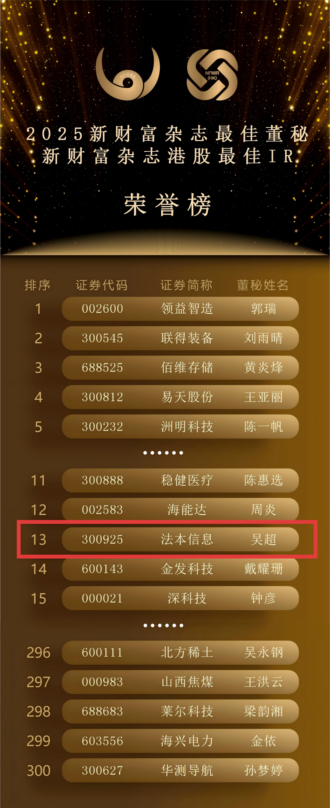 “2025新财富杂志最佳董秘、港股最佳IR”评选结果近期出炉,法本信息成为少数同时斩获两大奖项的上市公司,公司董事、董事会秘书兼副总经理吴超获“最佳董秘”荣誉,证券事务代表孙波荣获“最佳证券事务代表奖”。