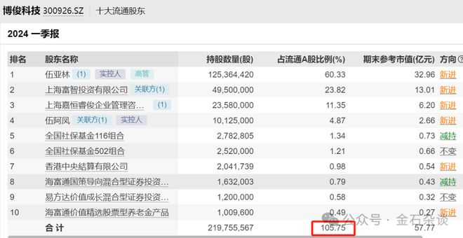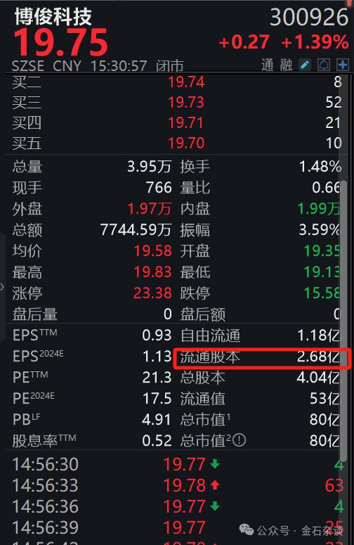 那这个105.75%怎么来的呢?原因是统计的博俊科技流通股股份为2.08有亿股,2.19/2.078就是105.75%了。