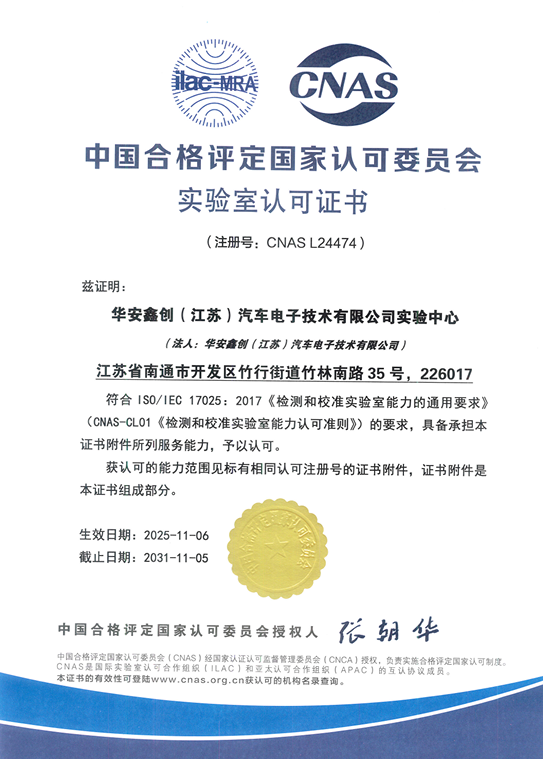 近日,华安鑫创(江苏)汽车电子技术有限公司实验中心正式通过中国合格评定国家认可委员会评审,获得ISO/IEC 17025:2017实验室认可证书(注册号:CNAS L24474),正式跻身国家认可实验室行列。此次获认可,不仅是对华安鑫创实验室技术能力、质量管理、服务水平的全方位肯定,更标志着实验室出具的检测报告权威可信,助力实验室的公信力跃上新台阶。