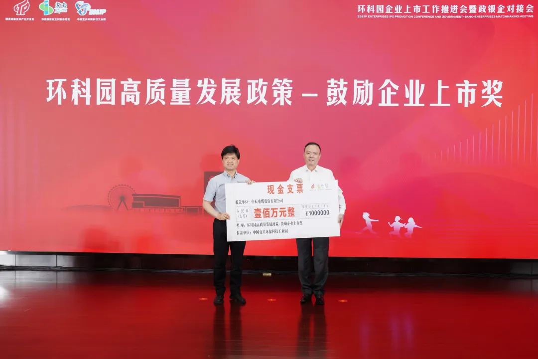 为深化政银企合作,加快推动园区企业上市步伐,5月31日上午,环科园召开企业上市工作推进会暨政银企对接会。宜兴市人民政府副市长金磊,市政府党组成员、环科园党工委副书记、管委会副主任储红飙等出席会议。中辰股份董事长杜南平代表公司领取“环科园高质量发展政策--鼓励企业上市奖”。