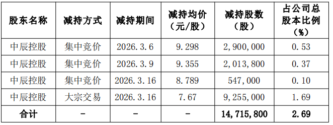 自本次减持计划实施至今(2026年3月6日至2026年3月16日),中辰控股以集中竞价交易及大宗交易的方式共计已减持公司股份14,715,800股,占公司总股本的2.69%,减持均价为7.67元/股至9.355元/股,本次减持计划期限已届满,本次减持计划已实施完成。