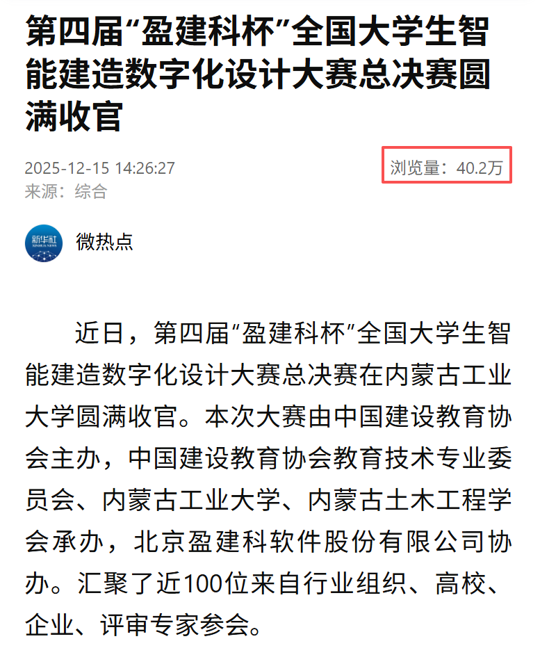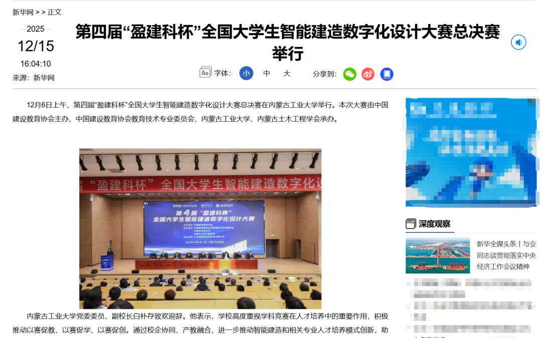 赛后,本次大赛受到央视网、新华社、新华网、光明教育网等媒体宣传报道,本届大赛的成功举办贯彻落实了国家创新驱动发展战略,推动智能建造与数字化技术在土木工程领域的深度融合,为培养高素质复合型人才搭建了一个高水平的全国大学生学术交流与技能竞技舞台,进一步促进了智能建造技术的普及、深化产教融合,为行业高质量发展培育新生力量。