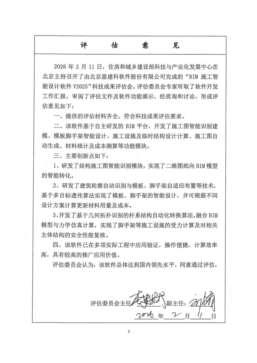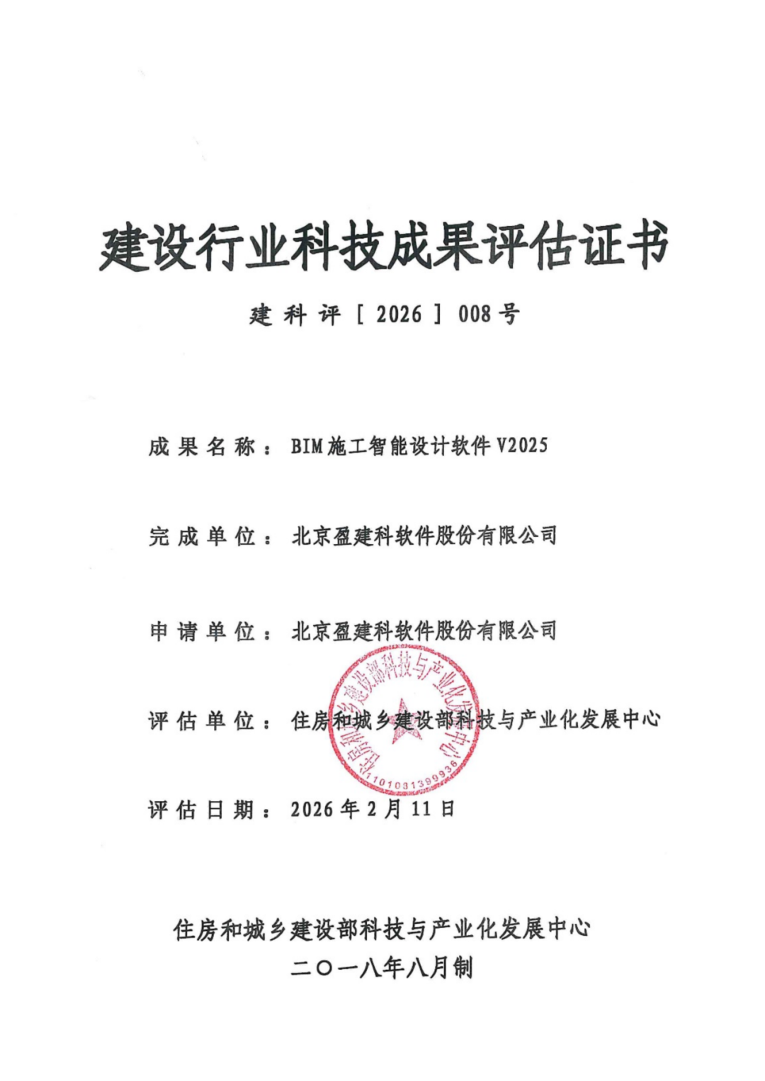 2026年2月11日,住房和城乡建设部科技与产业化发展中心在北京主持召开了由北京盈建科软件股份有限公司完成的“BIM施工智能设计软件V2025”科技成果专家评估会。评估委员会由7位行业权威专家组成,依照住建部规定的程序和标准,对软件进行科学、专业的专家论证与评估,一致同意通过科技成果鉴定,认为软件整体达到“国内领先水平”。