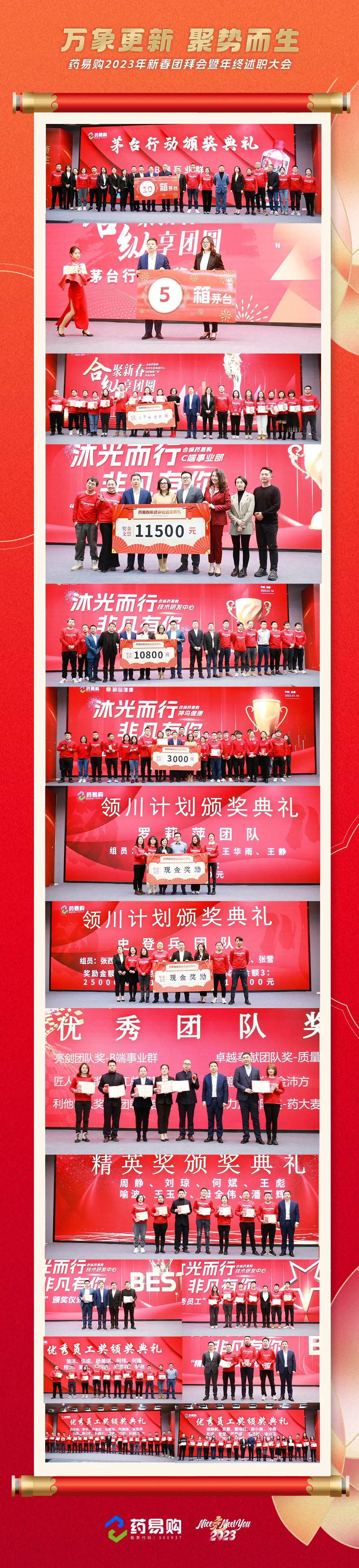 2022年的机遇和挑战为药易购全体员工搭建了施展才华的宽阔舞台,在这一过程中,公司涌现出了一大批优秀员工代表,他们不仅是公司不断前进的主力军,更是药易购文化的最好诠释者与践行者。为表彰他们在2022年度的辛勤付出与突出贡献,充分发挥典型示范引领作用,把榜样的力量化为奋进新征程的强大动力,在本次大会期间特设了隆重的颁奖典礼,并颁发了“精英奖”、“优秀员工”、“战略协同团队”、“无限飞跃团队”等多个年度大奖。