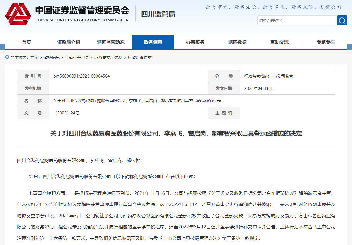 4月13日,中国证监会四川监管局网站公布一则《关于对四川合纵药易购医药股份有限公司、李燕飞、雷启岗、郝睿智采取出具警示函措施的决定》。