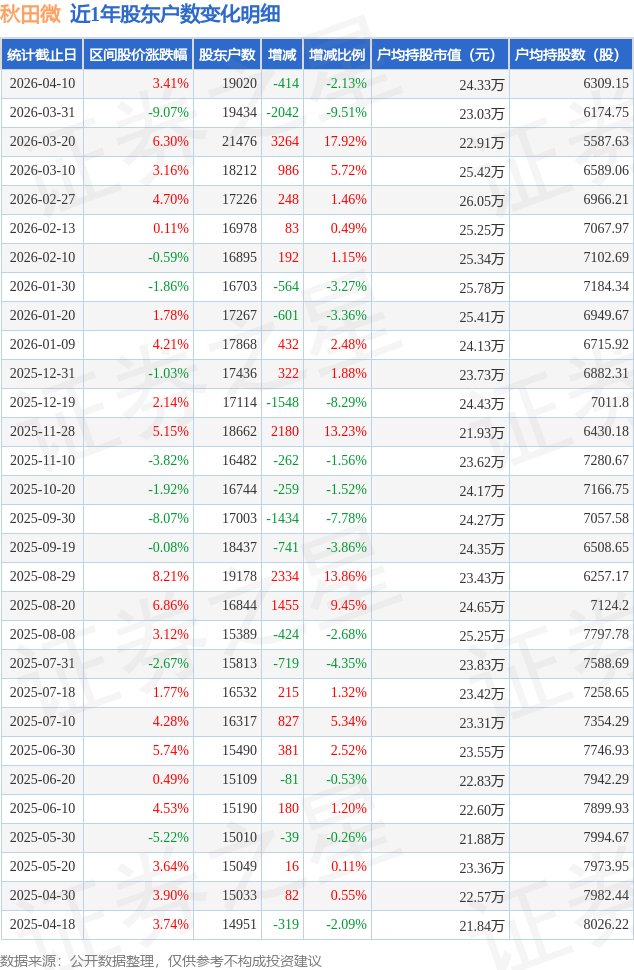 从股价来看,2026年3月31日至2026年4月10日,秋田微区间涨幅为3.41%,在此期间股东户数减少414.0户,减幅为2.13%。