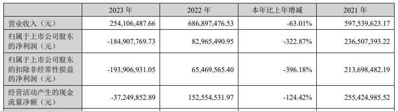 2023年,易瑞生物实现营业收入2.54亿元,同比下降63.01%;归属于上市公司股东的净利润-1.85亿元,上年同期为8296.55万元;归属于上市公司股东的扣除非经常性损益的净利润-1.94亿元,上年同期为6546.96万元;经营活动产生的现金流量净额为-3724.99万元,上年同期为1.53亿元。