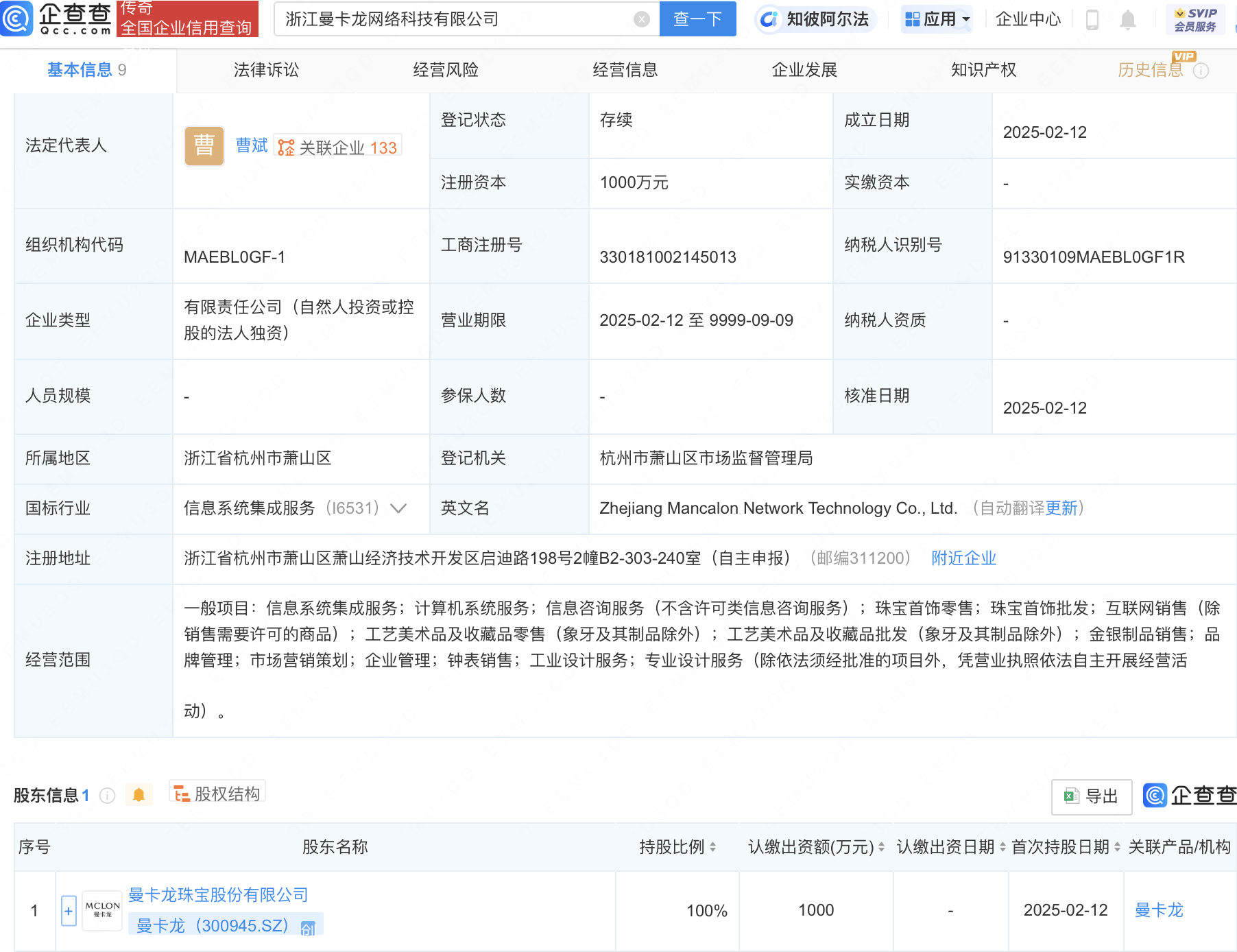 近日,浙江曼卡龙网络科技有限公司成立,法定代表人为曹斌,注册资本1000万元,经营范围包含:金银制品销售;品牌管理;市场营销策划;企业管理等。股权穿透显示,该公司由曼卡龙(300945)全资持股。