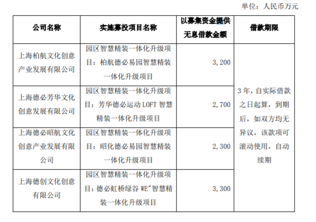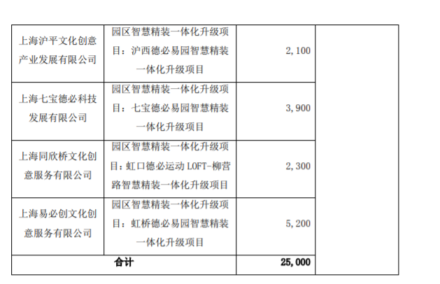 其中,“园区智慧精装一体化升级项目”的项目投资总额为29508.95万元,拟用募集资金金额为25000万元。该项目由德必集团的全资子公司、孙公司上海柏航文化创意产业发展有限公司、上海德必芳华文化创意发展有限公司、上海德必昭航文化创意产业发展有限公司、上海德创文化创意有限公司、上海沪平文化创意产业发展有限公司、上海七宝德必科技发展有限公司、上海同欣桥文化创意服务有限公司、上海易必创文化创意服务有限公司具体实施。