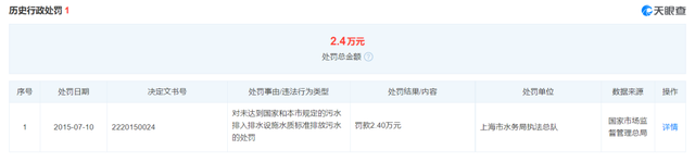此次并非上海德必首次受罚,资料显示,2015年7月,因对未达到国家和上海市规定的污水排入排水设施水质标准排放污水,公司被上海市水务局执法总队罚款2.40万元。
