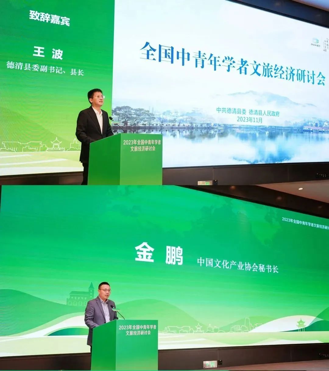 德清县委副书记、县长王波为本届研讨会作开幕致辞。他系统介绍了德清文化发展的资源禀赋和文化底蕴,指出德清文旅融合发展呈现出一座名山胜地的发展史、一段江南文化的传承史、一座千年古城的复兴史、一段文化标记的实践史。面对文旅经济发展的新始点,期待德清文旅品牌的知名度和影响力能得到一步提升。中国文化产业协会秘书长金鹏致辞时表示,大会积极响应党的二十大报告中“推进文化和旅游深度融合发展”号召,将文旅经济作为议题,极具现实意义和学术价值。文化和旅游部产业发展司副司长傅瀚霄强调,文化和旅游已经成为高质量发展、高品质生活的重要支撑,深度融入国民经济和社会发展大格局,在中国式现代化进程中将发挥越来越重要的作用。