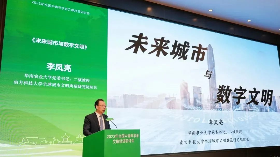 华南农业大学党委书记、南方科技大学全球城市文明典范研究院院长院长李凤亮以《未来城市与数字文明》为题发表主旨演讲。他指出,数字文明是未来城市的重要路向,数字文明不仅体现了今天文明生产力的数字跃迁,也是满足人的更好的美好生活需要的重要手段。构建未来城市的数字文明逻辑,即以人为本的根本价值逻辑、守正创新的传承创新逻辑和融会贯通的品牌定位逻辑。