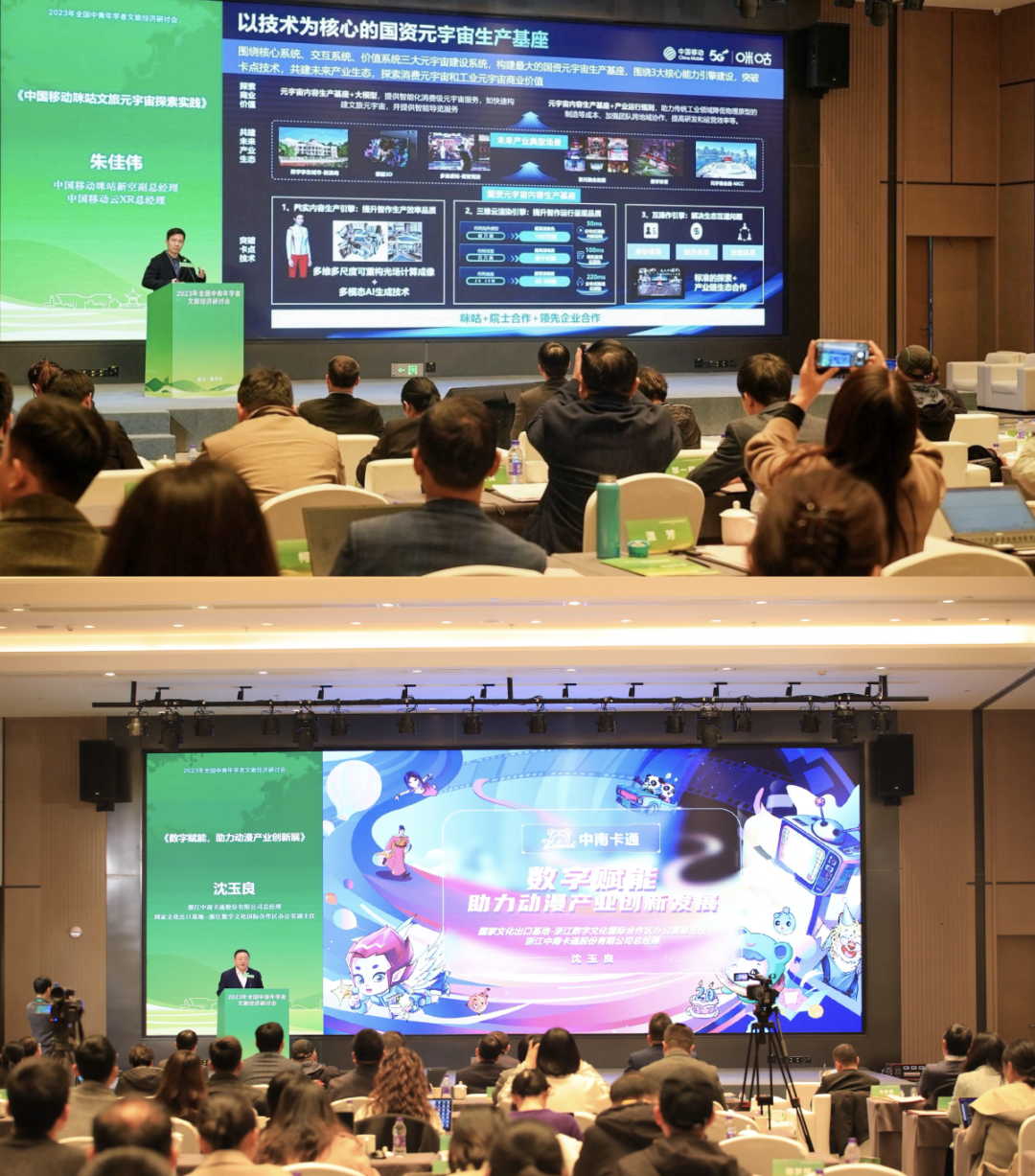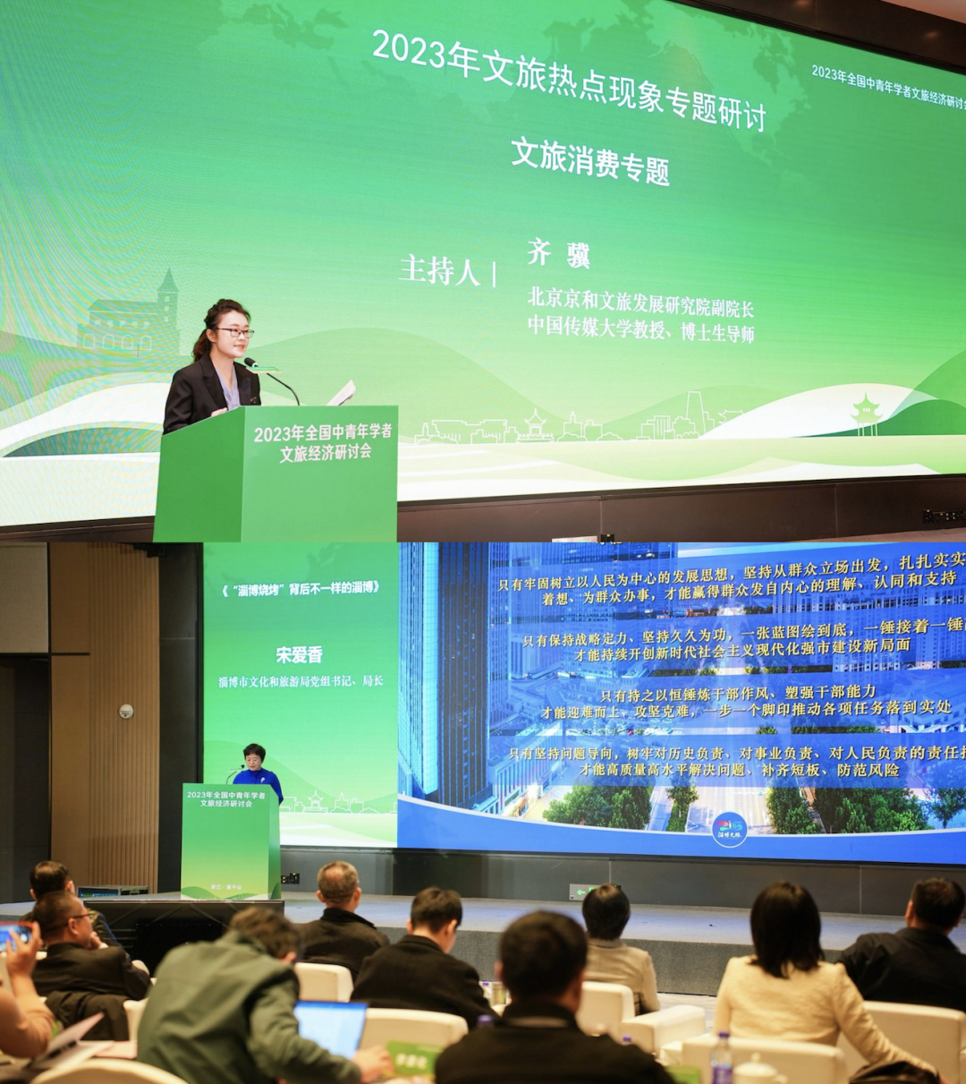 本次会议重视理论探讨与行业实践相结合,举办“2023年文旅热点现象研讨会”。研讨会围绕文旅消费与文化科技两大专题,精选淄博烧烤、贵州村超、石家庄摇滚之城、音乐剧《将进酒》、百度文心一言大模型、中国移动文旅元宇宙、中南卡通动漫产业探索、时光坐标虚拟制片、华兴控股沉浸式演艺、科大讯飞数字虚拟人等十个极具代表性和典型性的项目案例,邀请相关负责人进行现场分享。文旅消费专题由北京京和文旅发展研究院副院长齐骥主持。淄博市文化和旅游局局长宋爱香介绍了“淄博烧烤”走红始末和后续发展的相关思考,展现了新时代服务型政府的担当与作为。石家庄市文化旅游投资集团党委书记、董事长王晓辉介绍了“摇滚之城”的长期市场培育实践与长远规划,提出以文体旅深度融合打造城市文化IP的新思路。中国东方演艺集团北京东方新大陆文化艺术有限公司副总经理邹一鸣以音乐剧《将进酒》为例介绍了一台爆款演出剧目的诞生,并从衍生产品开发等角度分析了文化消费的新趋势。榕江县文旅产业顾问欧阳章伟讲述了贵州村超“三步走”战略,描绘了乡村振兴背景下全民共建、全民共享的生机活力。