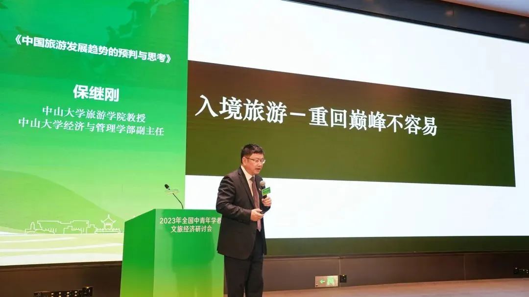 中山大学经济与管理学部副主任保继刚发表了题为《中国旅游发展趋势的预判与思考》的主旨演讲。他强调旅游具有较强的市场经济属性,继而从我国入境游市场恢复情况、出境游市场主要人群变化、旅游投资异化、消费税、旅游供给方式、低碳旅游、旅游数据统计等八个旅游产业发展面临的现实问题进行剖析。