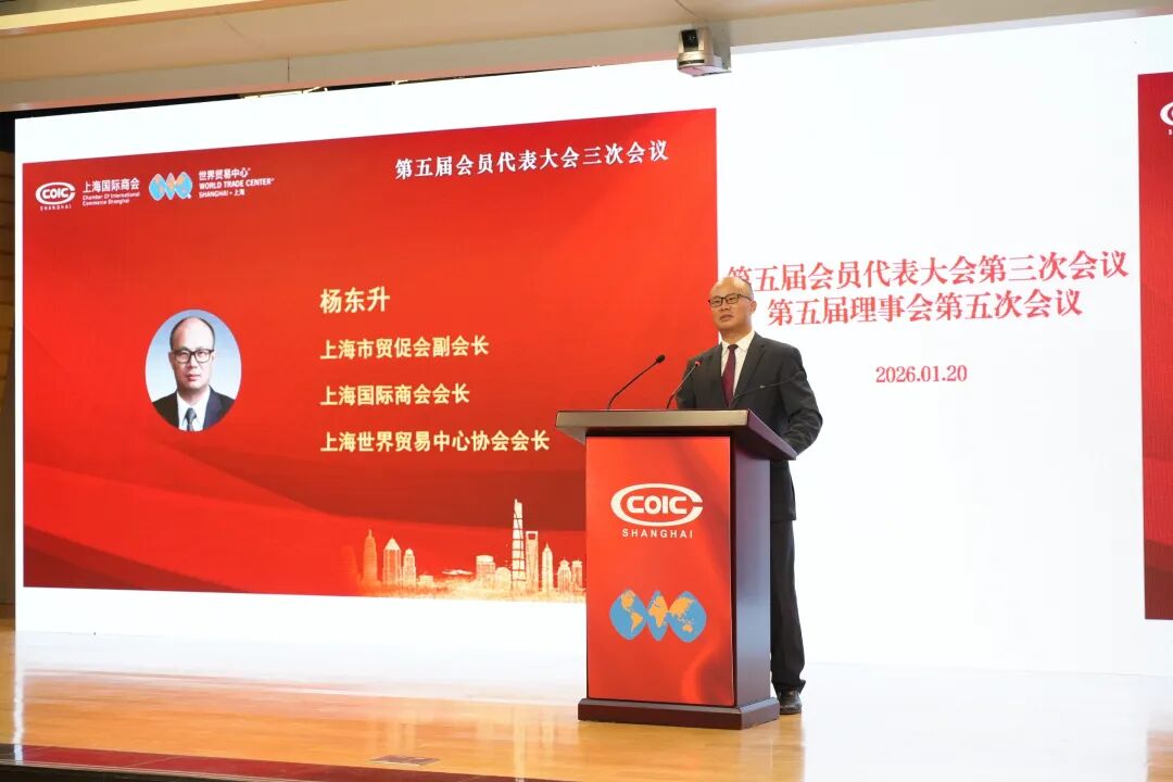 本次会议由上海国际商会、上海世界贸易中心协会联合主办,共有副会长、理事成员、部分会员代表及经贸界代表近200人参会。上海市贸促会副会长、上海国际商会会长杨东升出席会议。