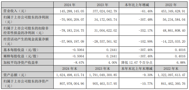 冠中生态(300948.SZ)近期披露的2024年年度报告显示,2024年公司实现营业收入1.45亿元,同比下降61.46%;归属于上市公司股东的净利润-7090.02万元,上年同期为3417.21万元;归属于上市公司股东的扣除非经常性损益的净利润-7818.32万元,上年同期为3100.46万元;经营活动产生的现金流量净额-5796.92万元,上年同期为-2855.76万元。
