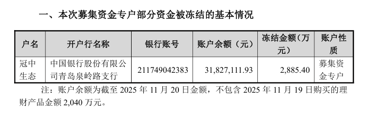 11月21日, 青岛冠中生态 股份有限公司(下称“冠中生态”)一纸募集资金专户部分资金被冻结的公告,引起资本市场的关注。