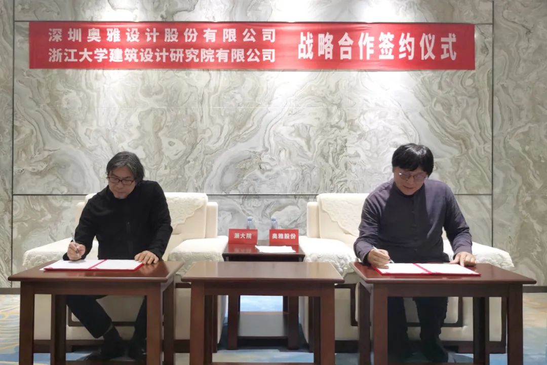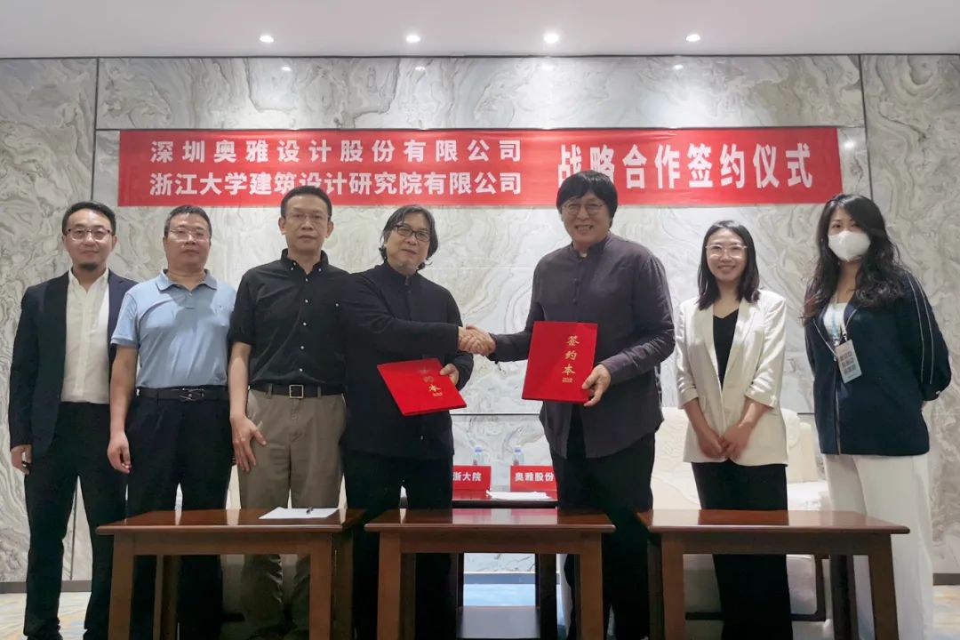 近日,奥雅股份与浙江大学建筑设计研究院有限公司(以下简称:浙大设计院)签订战略合作协议。浙江大学建筑设计研究院有限公司董事长、首席总建筑师、浙江大学平衡建筑研究中心主任董丹申,浙江大学建筑设计研究院副院长、副总建筑师王健,浙江大学建筑设计研究院市场主任李佳,浙江大学建筑设计院副总规划师、山东分公司副总经理张元勋,奥雅股份创始人、董事长、首席设计师李宝章,奥雅杭州公司总经理徐荷等出席签约仪式。