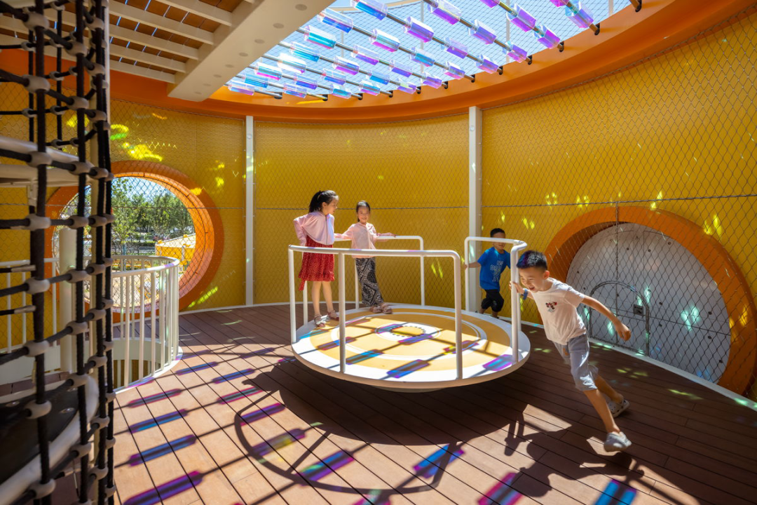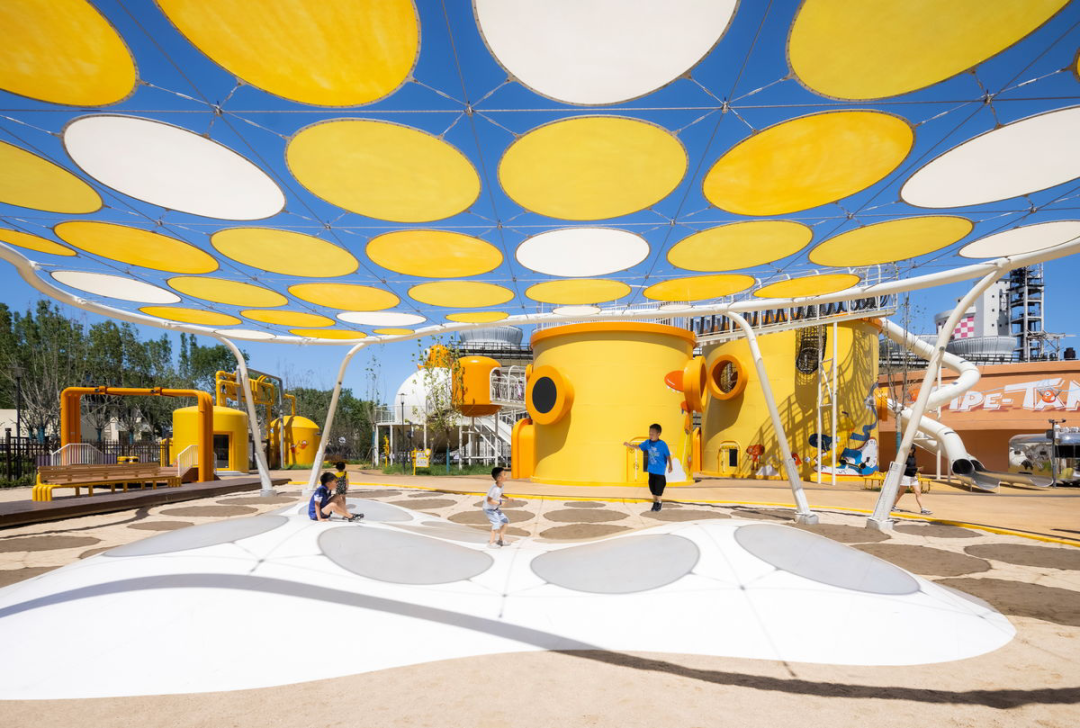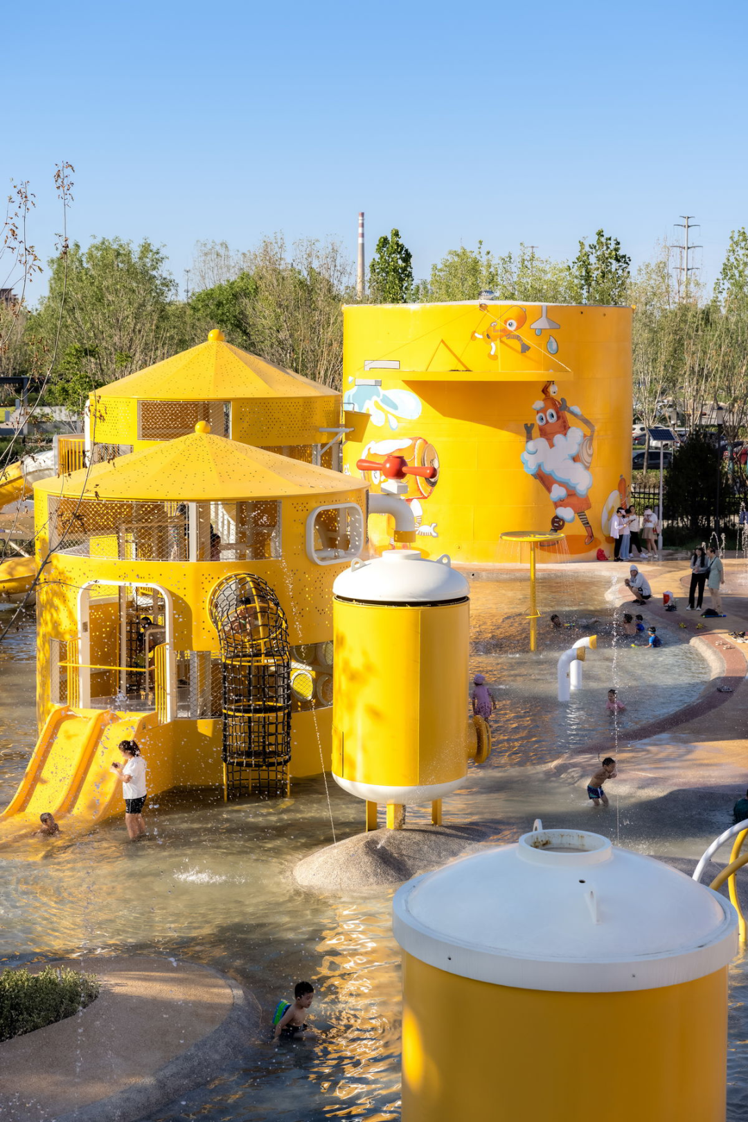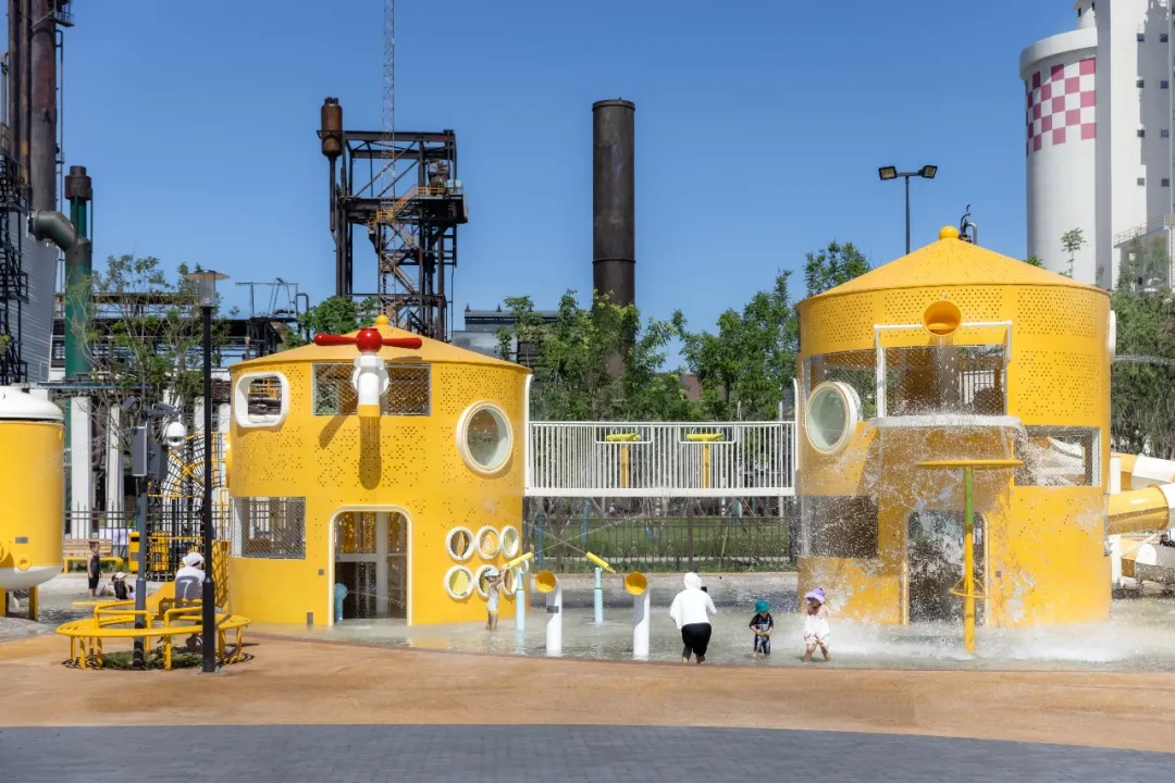 如今,这里集工业博物馆、儿童乐园、火车月台、工业艺术森林、工业非遗记忆馆、河畔活水公园、综合服务中心等业态为一体,再将原有的大罐、小罐和管道,改造成为工业主题包装的游乐设备和配套建筑,同时在工业风貌的基调上融入潮流元素和科技互动,融入特色IP与水净化科普,成为全国首个工业遗址改造更新的儿童友好示范乐园。