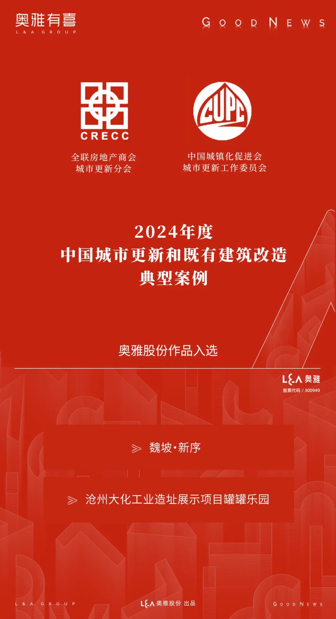 近日,第八届城市更新创新大会在北京召开,大会以“新质力量更新永续”为主题,聚焦城市更新中的新质力量。会上,《2024年度中国城市更新和既有建筑改造典型案例汇编》重磅发布,经大众网络票选、专家组审查等程序综合考量,奥雅股份(股票代码:300949)作品“魏坡·新序”和“沧州大化工业造址展示项目罐罐乐园”双双入选,并获评2024年度贡献单位,成为城市更新和既有建筑改造工作的样本与范例。