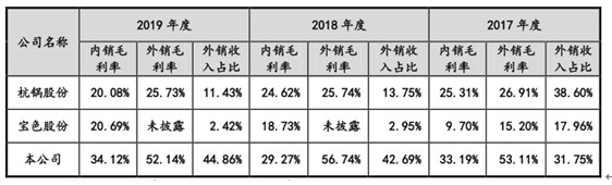 以业界标杆杭锅股份为例。报告期内,杭锅股份的内销毛利率分别为25.31%、24.62%和20.08%,外销毛利率分别为26.91%、25.74%和25.73%,内、外销毛利率差值分别仅为1.60%、1.12%和5.65%。无论是内、外销渠道,毛利率的走势都被德固特压制一头,尤其是外销毛利率低出近30%,差距较大。