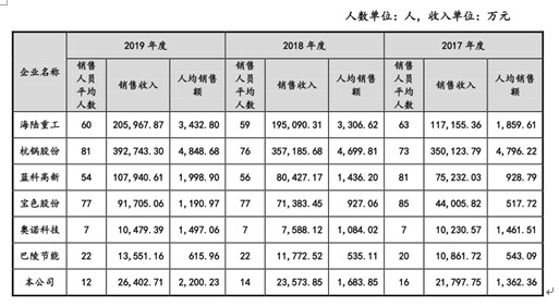 如上表所示,2018年和2019年,德固特销售人员人均销售额均排在行业第三位,仅少于海陆重工和杭锅股份;在这种情况下,销售人员薪酬却大幅低于行业均值,令人不解。不仅如此,随着德固特销售收入的不断增长,公司销售人员数量却逐年减少,2017-2019年公司销售人员平均人数分别为16人、14人和12人,背离情况十分明显。