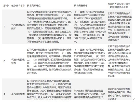 其中,气气高温换热技术方面,德固特的代表产品950度超高温列管换热器在2013年被山东省经济和信息化委员会认定为国内首台套产品,经青岛市经济和信息化委员会认定,上述产品的技术达到国内外领先水平;气液余热回收技术方面,公司气液余热回收技术的代表产品套管式急冷锅炉在2015年被山东省经济和信息化委员会、山东省财政厅认定为为山东省首台套技术装备,经青岛市经济和信息化委员会认定,上述产品的技术达到国内领先水平。