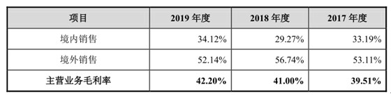 报告期内,德固特主营业务毛利率分别为39.51%、41.00%、42.20%,远超同行可比公司均值。其中,公司外销毛利率远高于内销毛利率,与同行可比公司存在较大差异。发行人按照境内外销售划分的主营业务毛利率情况如下表: