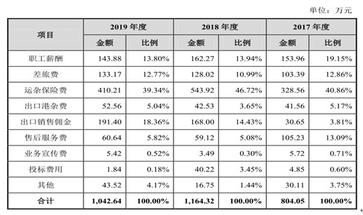 同期,德固特实现收入2.18亿元、2.36亿元和2.64亿元,2018年和2019年同比分别上涨8.26%和11.86%。可以看到,在销售费用中,公司职工薪酬、运杂保险费、售后服务费以及投标费用均与销售收入增长出现背离。在2019年德固特营收增速11.86%的情况下,公司销售职工薪酬较上2018年减少18.39万元;运杂保险费减少133.71万元;投标费用减少38.38万元,售后服务费则从2017年的105.23万元减少至60.64万元。