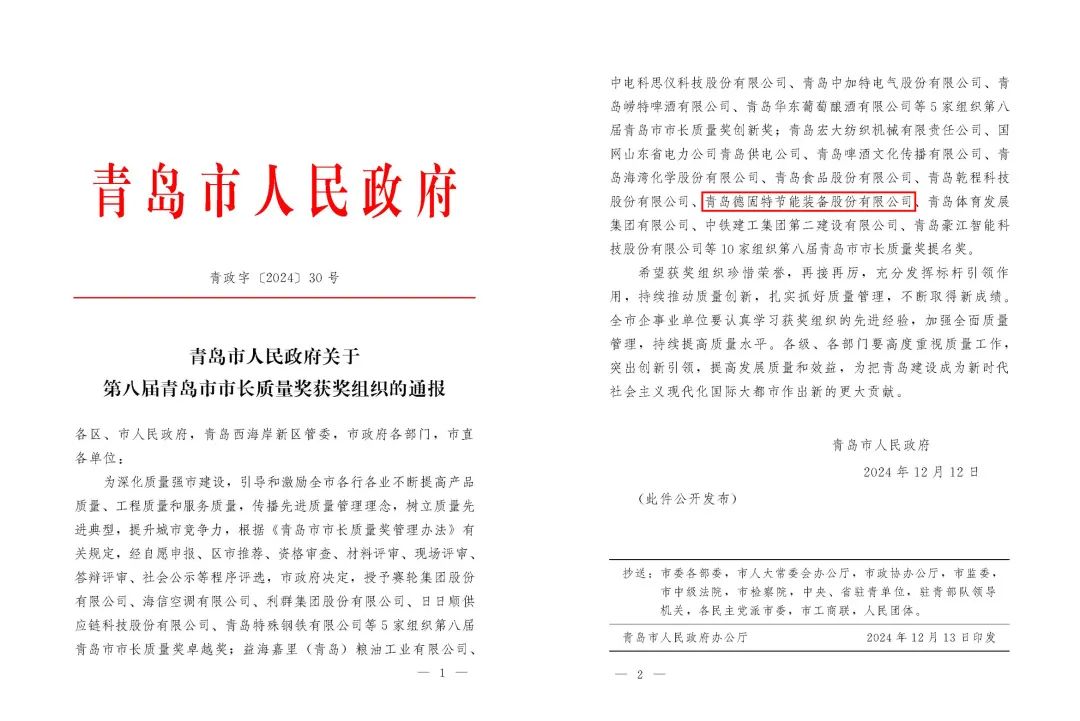 日前,青岛市人民政府通报了“第八届青岛市市长质量奖获奖组织”,青岛德固特节能装备股份有限公司喜获“第八届青岛市市长质量奖提名奖”。这是对德固特全面导入卓越绩效评价准则后,贯彻全员卓越绩效,持续推动质量创新,扎实做好质量管理,助推节能环保产业高质量发展的肯定和褒奖。