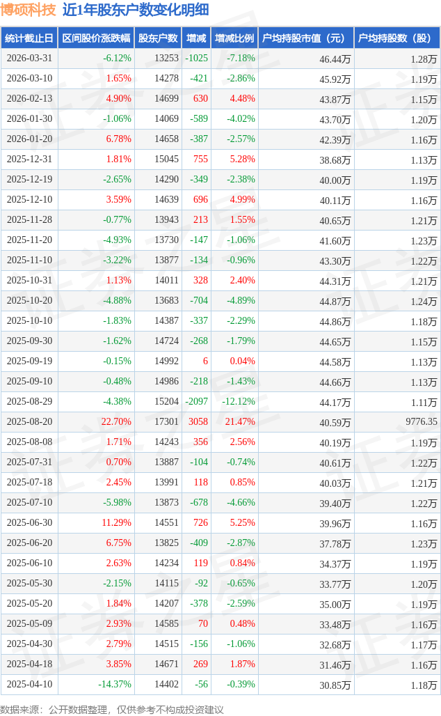 近日博硕科技披露,截至2026年3月31日公司股东户数为1.33万户,较3月10日减少1025.0户,减幅为7.18%。户均持股数量由上期的1.19万股增加至1.28万股,户均持股市值为46.44万元。